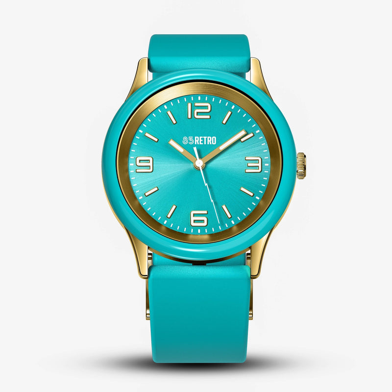 Built to coordinate with your sneakers—channeling a clean, retro-sport aesthetic. Aqua sunray dial paired with striking gold accents.