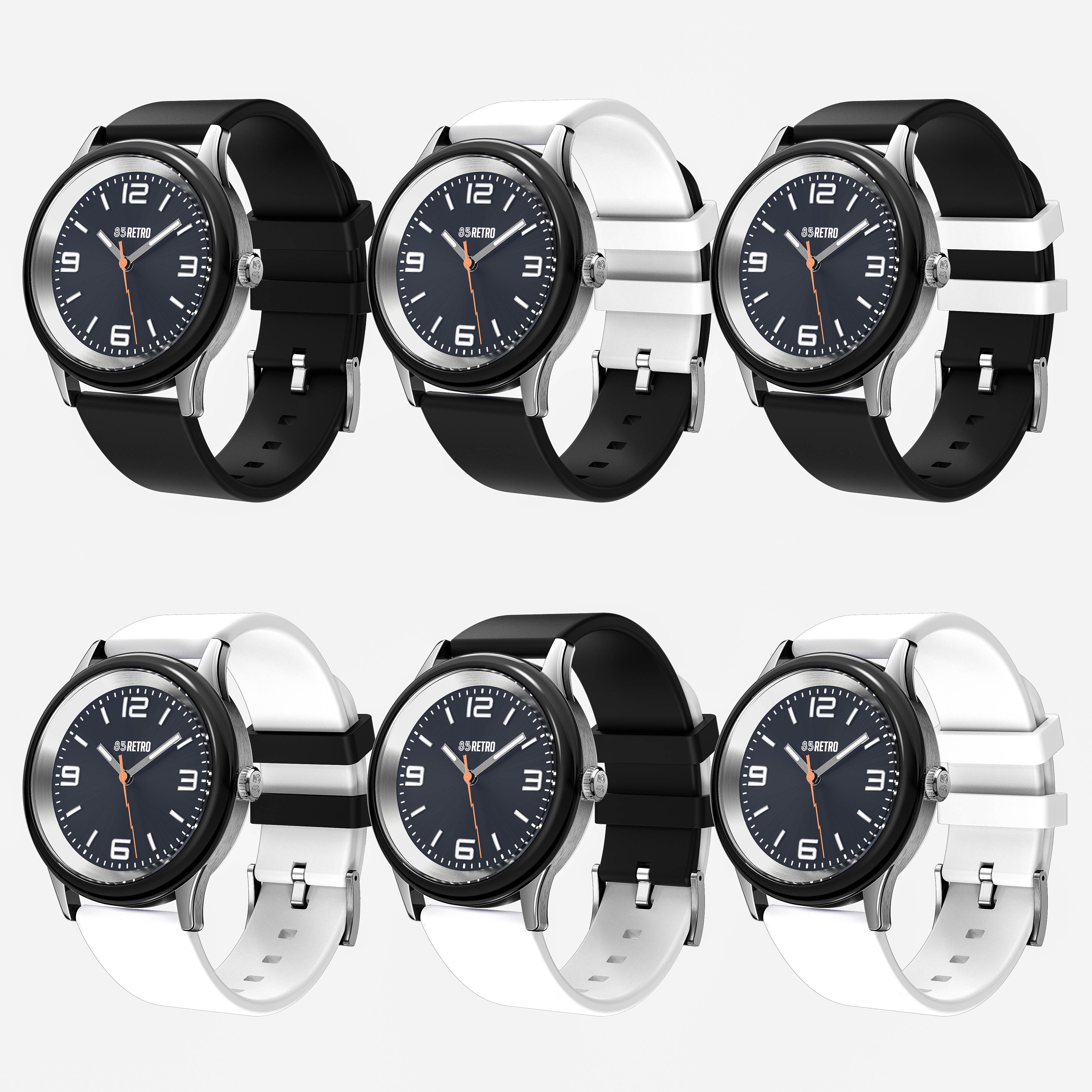 - Straps: Two silicone straps - Black and White