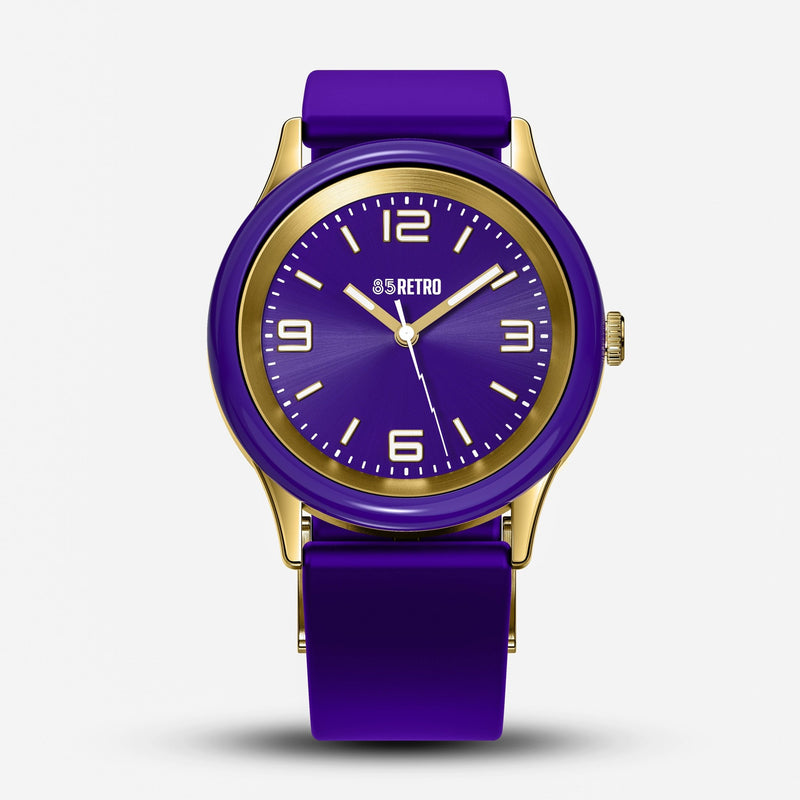 Built to coordinate with your sneakers—channeling a clean, retro-sport aesthetic. Royal purple sunray dial framed by striking gold accents.